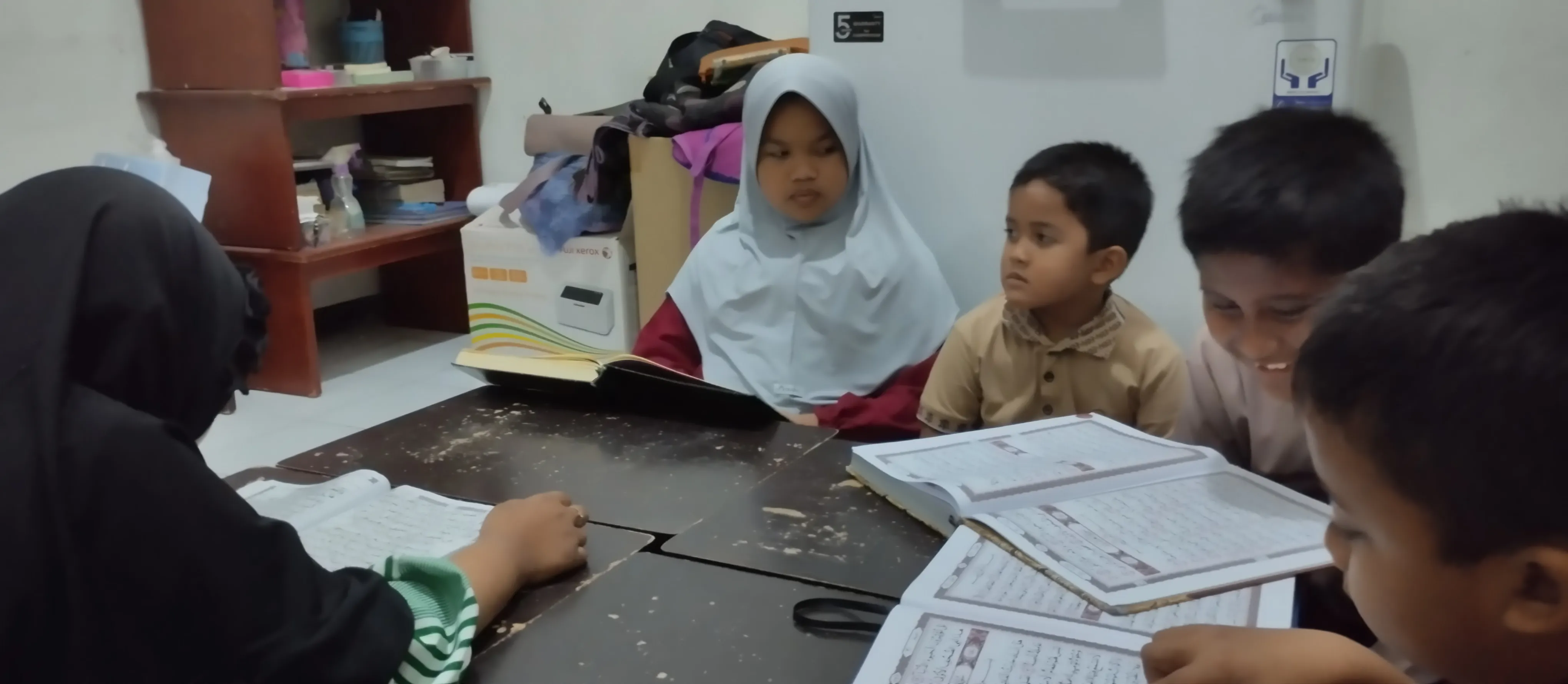 Selain pelajaran umum, rumah belajar juga rutin mengadakan kegiatan spiritual. Seusai Magrib, anak-anak membaca Al-Qur’an secara bergiliran, dibimbing oleh para ustadz dan ustadzah. Tidak hanya bacaan diperbaiki, mereka juga diberi pemahaman tentang tajwid, adab membaca, hingga nilai-nilai kehidupan yang terkandung di dalam ayat.