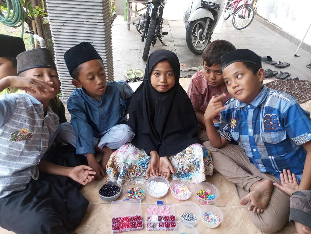 INSAN MANDIRI - Memanfaatkan momen liburan semester genap, adik-adik sanggar dari desa Simogirang, kecamatan Prambon, berkreasi dengan membuat kerajinan tangan bunga kaca. Dibimbing oleh Kak Ida dan Ustadzah Lilin selaku guru sanggar, mereka tampak ceria dan bersemangat dalam proses pembuatannya.