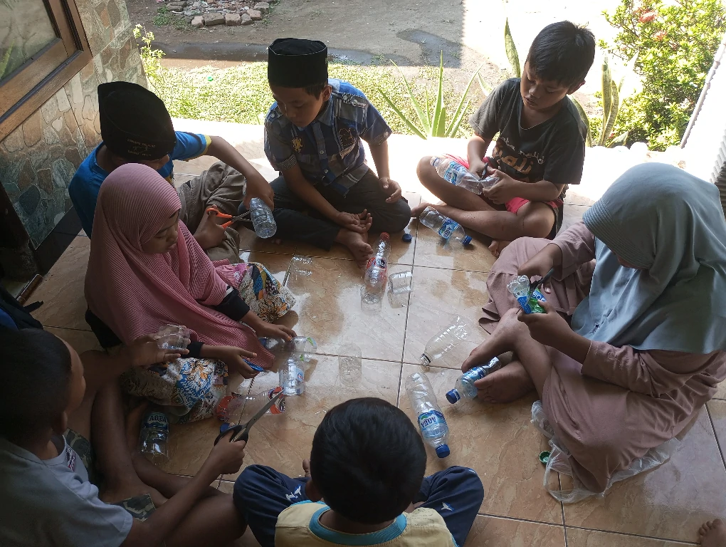 Berbekal botol bekas, batu, manik-manik, kain flanel, dan kertas warna, para adik sanggar mengubah bahan-bahan sederhana ini menjadi gelang, pot, dan bunga yang cantik untuk menghiasi ruang tamu.