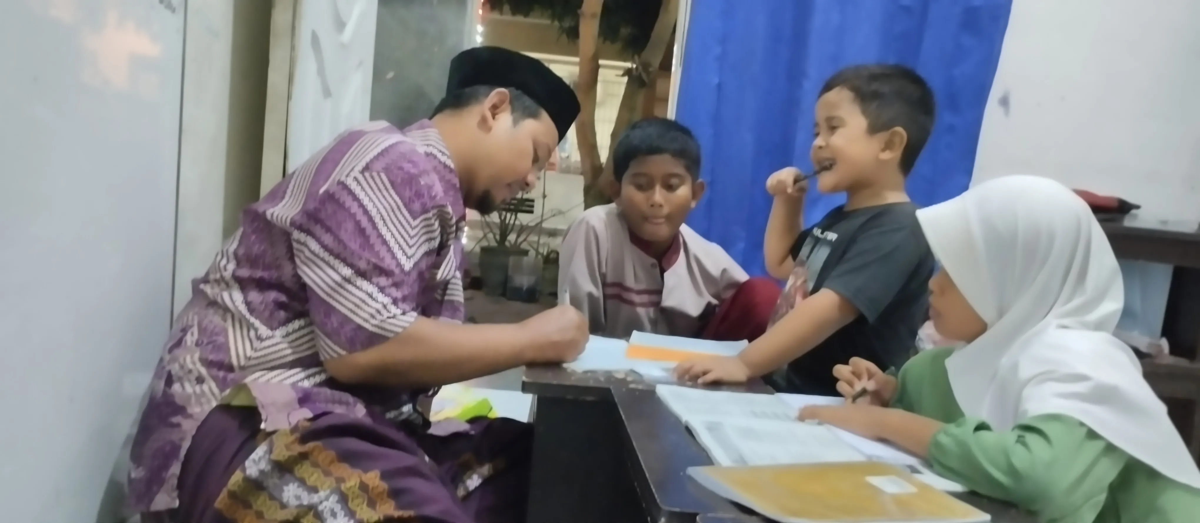 Selain pelajaran umum, rumah belajar juga rutin mengadakan kegiatan spiritual. Seusai Magrib, anak-anak membaca Al-Qur’an secara bergiliran, dibimbing oleh para ustadz dan ustadzah. Tidak hanya bacaan diperbaiki, mereka juga diberi pemahaman tentang tajwid, adab membaca, hingga nilai-nilai kehidupan yang terkandung di dalam ayat.